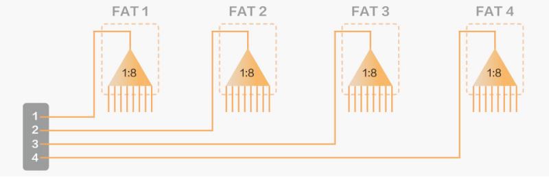 不等比例分光器的優(yōu)點,是大大減少了分光器到局端的光纜總數(shù)量, 4個分光器之間,以及到局端方向,僅需一根單芯光纜即可。如果是等比例分光呢?就必須用4根光纖了(如圖3)。