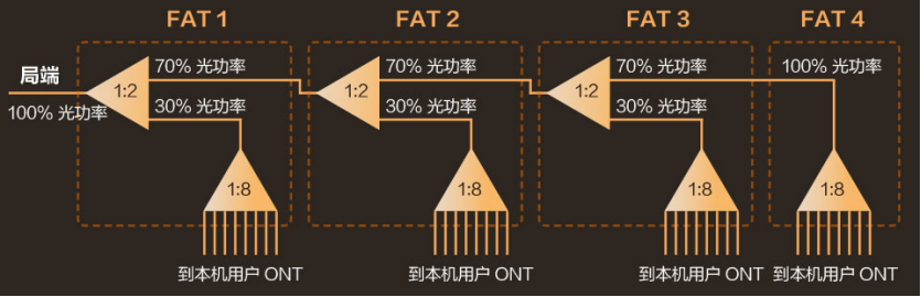 通常,將多個這種不等比分光器進行“級聯(lián)”,如4級“級聯(lián)”(如圖2),前三個都是不等比例分光,第四個分光器是等比例分光,即局端來的光功率100%留給了FAT4本機用戶。雖然第三個、第四個分光器的局端光功率絕對值相對較小,但是,也仍然能夠滿足其本機用戶的需要。