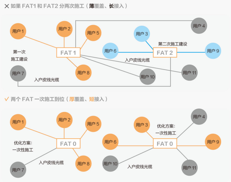 當FAT1首先裝滿,沒有空閑端口了,在FAT1周邊的新用戶(如用戶7)無奈需要連接到FAT2。同樣,入戶安裝距離太長,大大增加了入戶裝機成本。