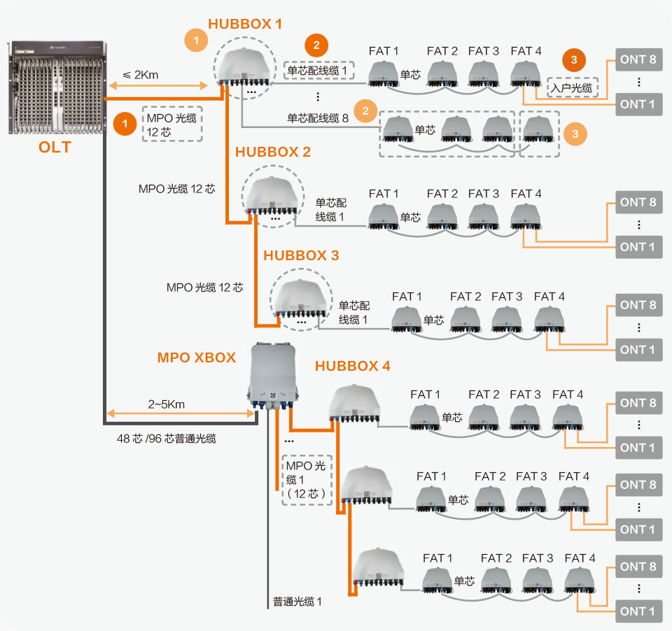 此方案(如圖9)包含三個盒子,即HUBBOX、SUBBOX、ENDBOX和三根纜,即MPO光纜、單芯配線纜、入戶光纜。每個HUBBOX對4個GPON口的纖芯進行1:2分光,輸出8條鏈路。SUBBOX是不等比分光,可級聯(lián)4個FAT,每個FAT可連接8個用戶。離OLT較遠的區(qū)域可用普通光纜+MPO XBOX方案,XBOX不僅可以直接與12芯預連接光纜相連,還可以與普通光纜連接輸出。方案全程預連接,非常適合架空場景,安裝效率高、故障率低。