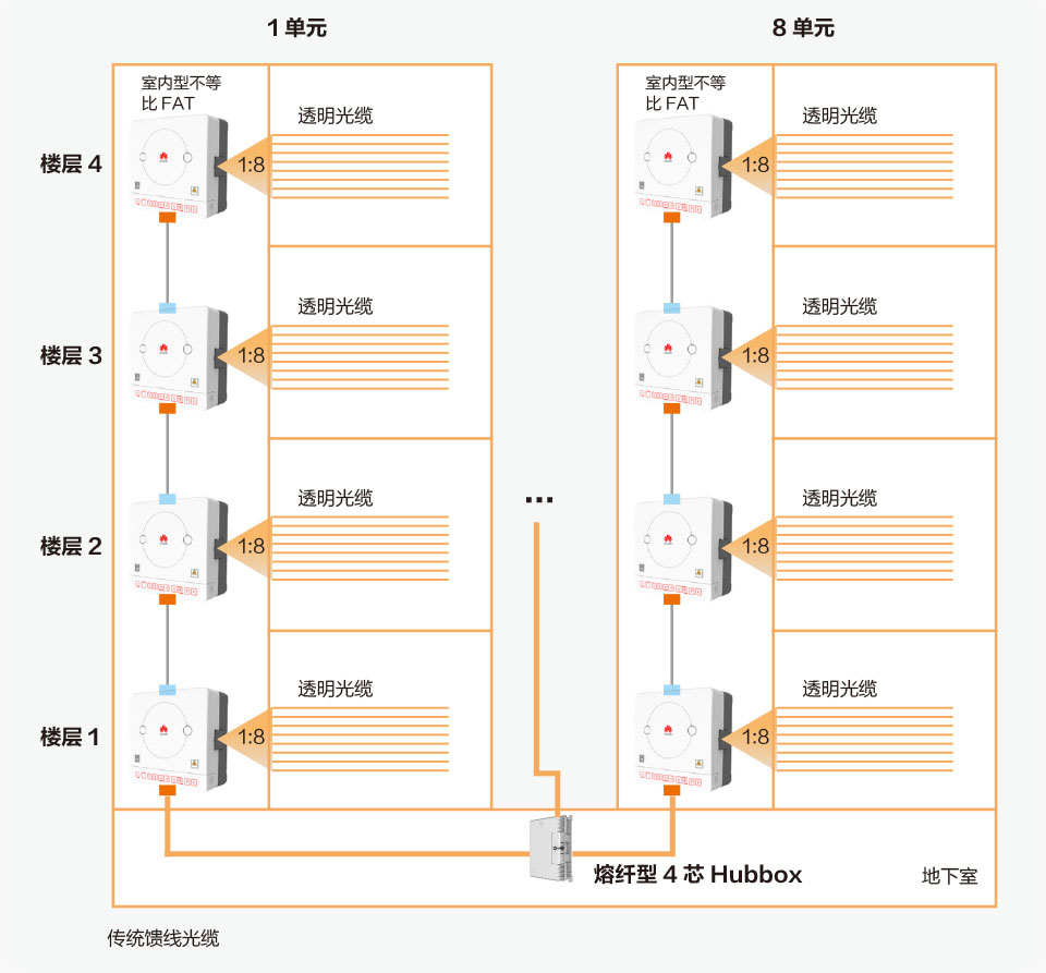此方案(如圖11)是傳統(tǒng)饋線光纜進樓,與HUBBOX相連,每個HUBBOX內(nèi)裝4個1:2分光器,出8條鏈路,每條鏈路級聯(lián)4個FAT,覆蓋一個單元32個用戶,比如每層樓有8個用戶,每個單元有4層,共計可覆蓋8個單元,256個用戶。